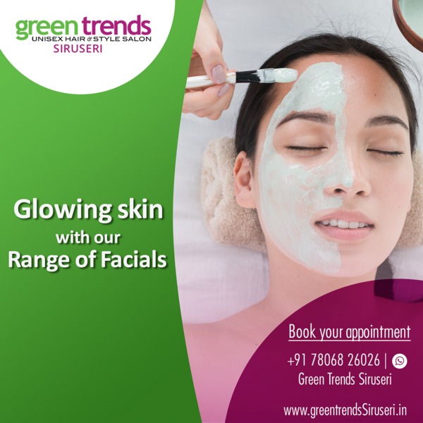greentrends Siruseri offer wide range of facials for a glowing skin. - Facials for dehydration - Facials for fine lines, wrinkles - Facials for skin lightening - Facials for pigmentation and dark spots - Facials for dullness - Facial add-ons - Express glow facials Our beauticians can check your skin conditions and based on your requirements will suggest you the right facial service to take. Along with that you can discuss about the best skin care regime that you can continue at home. Step into Green Trends Siruseri or Call us at 7806826026 to schedule your appointment today. Landmark: Above Cafe Coffee Day & amp; Kovai Pazhamudhir Nilayam.