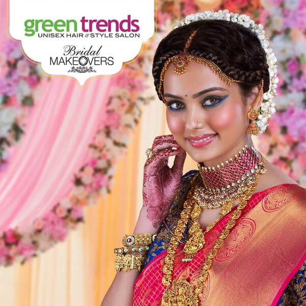 Have a conventional wedding with Green Trends' traditional makeover. The traditional saree with long braid hairdo adorned with flowers and ornaments will make your wedding the ultimate traditional ceremony. With Green Trends' have a beautiful wedding that is tailored to suit you. Walk-in to green trends Siruseri or call us to schedule your appointment. Landmark: Above Cafe Coffee Day, Opposite Thottam Nursery. Phone : 7806826026.