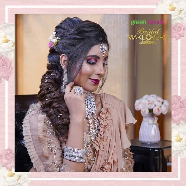 Look your royal best with this ‘Pretty Princess’ look. This contemporary style focuses on a bold cut crease technique used to enhance the shape of the eye, glitters that lift up the eye shade and glossy wine red lips. This playful look also allows you to let your hair down with the Mermaid Braid which has soft curls framing the face. White stones and carnation flowers adorn the loose braid, making it perfectly glamorous. With dazzling jewellery and a flowing outfit, you will look effortlessly stunning at your reception or sangeet. Walk-in to green trends Siruseri or call us to schedule your free consultation. Begin your bridal journey with us. Landmark: Above Cafe Coffee Day, Opposite Thottam Nursery. Phone - 7806826026.