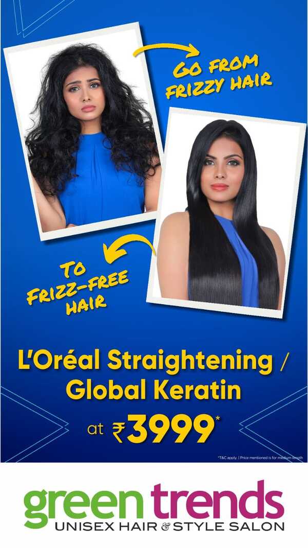 💥OFFER 💥 Experience frizz-free silky hair with L’Oreal Straightening/Global Keratin by expert stylists at just Rs. 3999 onwards at one of India's leading salon chains. Our salon ensures ✓ Vaccinated Stylists ✓ 40+ Safety Protocols ensured ✓ Certified Disinfected Salons ✓ Temperature Verified Stylists ✓ Disposable Towels & amp; Capes ✓ Sanitized & amp; Sterilized Tools ✓ Contactless Service with Gloves