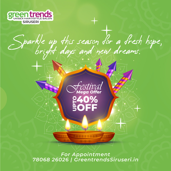 Sparkle up this season for a fresh hope, bright days and new dreams. Festival mega offer @ greentrends Siruseri (Above Cafe Coffee Day & Opp. Thottam Nursery). Enjoy upto 40% off. Fashion colouring, Global Colouring, Hair Straightening, Smoothening, Keratin Treatment, Mega Saver Combo Packages for Facials, Hairspa, Waxing, Pedicure, and more. Choose the one that suits you. Participate in the Diwali contest and get a chance to win greentrends gift card worth Rs. 2000. Check out our Facebook page and WhatsApp status for details. Book your appointment and Enjoy Safe Salon Experience.