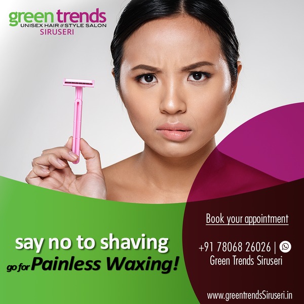 Throw away the razor. Say No to Shaving. Try Painless Waxing and flaunt your silky soft legs. We provide following types of waxing. - Honey Waxing - Flavoured Waxing - Rica Waxing - Brazilian Waxing - Cartridge Waxing Our trained professional beauticians will make sure you have the pain less experience. Step into Green Trends Siruseri or Call us at 7806826026 to schedule your appointment today. Landmark: Above Cafe Coffee Day & amp; Kovai Pazhamudhir Nilayam.