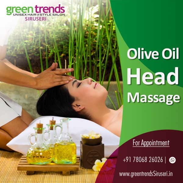 Your hair goes through a lot due to environmental and physical factors such as pollution, water quality etc adds up to a degradation of your hair quality. Don& #39;t worry. Try Olive Oil Head Massage. Olive oil is commonly used in scalp massages to moisturize and condition the scalp and dry hair. Olive oil helps to eliminate the dryness and rough ends giving you the flexibility to manage your hair according to your style. Olive oil helps to retain your hair’s natural texture. Olive oil deeply conditions your hair, making it intensely soft and silky. Olive oil moisturizes your scalp preventing the occurrence of dandruff. Olive oil helps to eliminate split ends. A better scalp blood circulation makes your hair follicles stronger thereby helping to produce hair strands that are softer, healthy and thicker. Step into Green Trends Siruseri or Call us at 7806826026 to schedule your appointment today. Landmark: Above Cafe Coffee Day & amp; Kovai Pazhamudhir Nilayam.